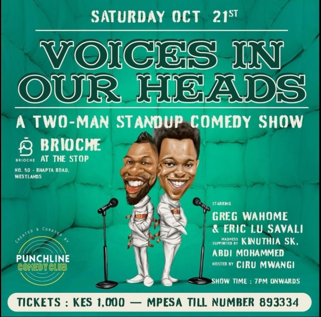 Eric Lusavali teamed up with Greg Wahome to showcase an electric show dubbed “Voices in Our Heads” to a sold out show at the Brioche on Rhapta Road. This concept of a two man show was experimental and proved successful, sources close to Punchline comedy club, who were the producers of the show, say that there are plans to have other editions of the show.