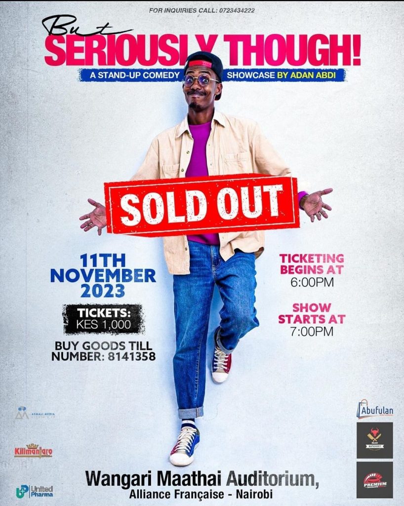 Adan Abdi pulled a surprise to many when he announced his solo show “But seriously though” and went on to perform it to a sold out show at the Wangari Maathai Theatre inside Alliance Francaise Nairobi and later in Mombasa.