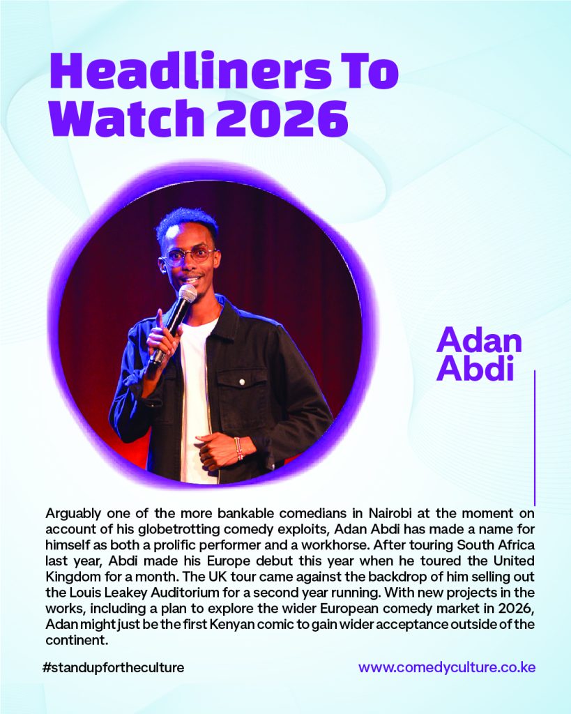Arguably one of the more bankable comedians in Nairobi at the moment on account of his globetrotting comedy exploits, Adan Abdi has made a name for himself as both a prolific performer and a workhorse. After touring South Africa last year, Abdi made his Europe debut this year when he toured the United Kingdom for a month. The UK tour came against the backdrop of him selling out the Louis Leakey Auditorium for a second year running. With new projects in the works, including a plan to explore the wider European comedy market in 2026, Adan might just be the first Kenyan comic to gain wider acceptance outside of the continent.