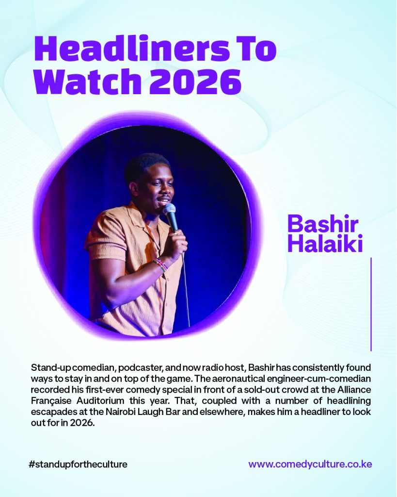 Stand-up comedian, podcaster, and now radio host, Bashir has consistently found ways to stay in and on top of the game. The aeronautical engineer-cum-comedian recorded his first-ever comedy special in front of a sold-out crowd at the Alliance Française Auditorium this year. That, coupled with a number of headlining escapades at the Nairobi Laugh Bar and elsewhere, makes him a headliner to look out for in 2026.