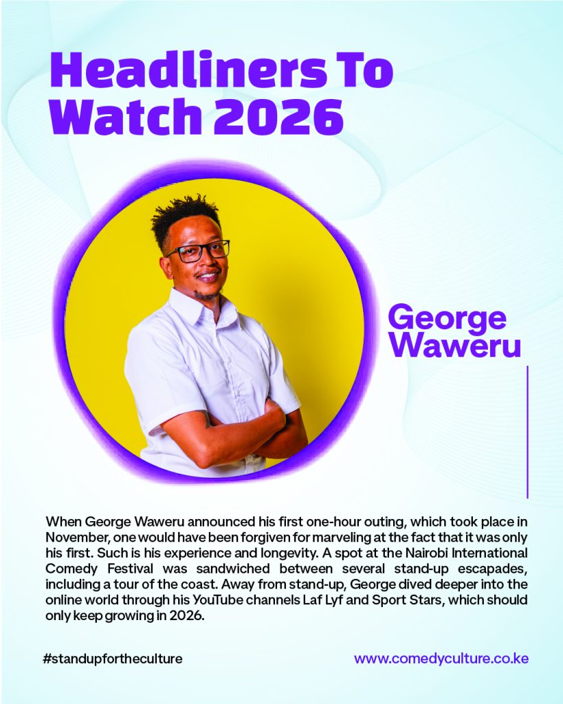 When George Waweru announced his first one-hour outing, which took place in November, one would have been forgiven for marveling at the fact that it was only his first. Such is his experience and longevity. A spot at the Nairobi International Comedy Festival was sandwiched between several stand-up escapades, including a tour of the coast. Away from stand-up, George dived deeper into the online world through his YouTube channels Laf Lyf and Sport Stars, which should only keep growing in 2026.