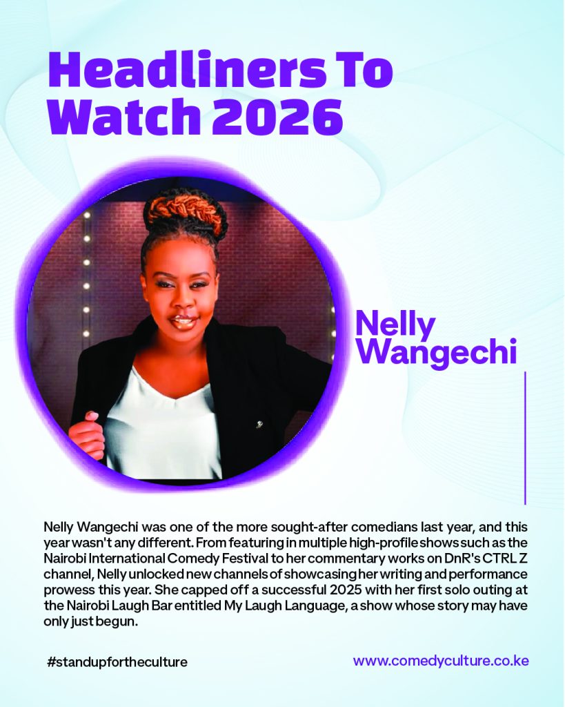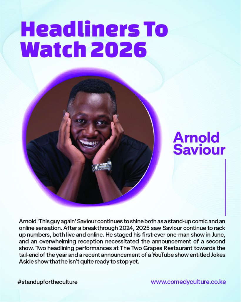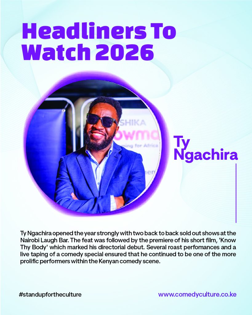 The Headliners To Watch – 2026 List features eight comedians who have proven to be heavy hitters over time. From doing solo shows to touring around Kenya and outside the country, these comics can be described as the creme de la creme of the current Kenyan stand-up comedy industry. These comics have been practicing the craft for more than four years, and each has performed in at least one other country outside Kenya. They all have either a comedy special to their name or have done one-hour-long shows both locally and internationally in recent times.